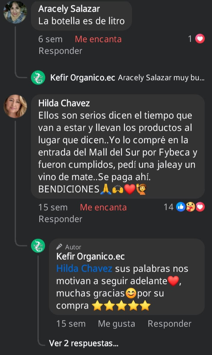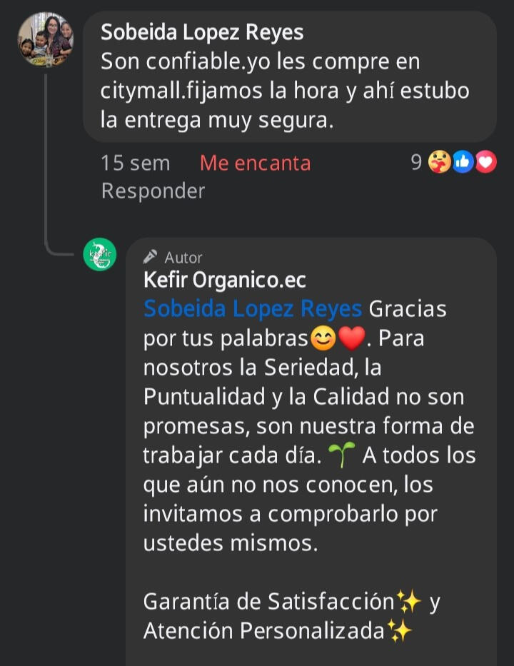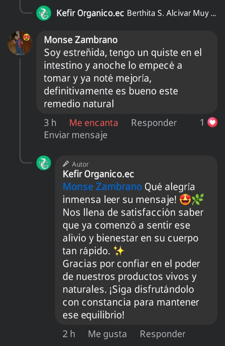 ⚠️ AVISO LEGAL IMPORTANTE Y DESCARGO DE RESPONSABILIDAD:Los productos de Kéfir Natural EC son alimentos artesanales de uso tradicional, NO son medicamentos.La información contenida en este sitio web tiene fines exclusivamente educativos e informativos, basada en la sabiduría ancestral y en enlaces a estudios científicos referenciales de los ingredientes. No pretende sustituir el diagnóstico, tratamiento o consejo médico profesional.Estos productos no están destinados a curar enfermedades. Los testimonios o descripciones de propiedades se refieren a los ingredientes naturales y los resultados pueden variar, ya que cada organismo es diferente.El consumo de estos productos es decisión personal y responsabilidad de quien los utiliza.Si usted tiene una condición médica preexistente, está embarazada o en periodo de lactancia, le recomendamos consultar a su médico de confianza antes de incorporar nuevos alimentos a su dieta.